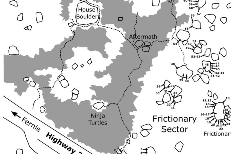 There is no formal guidebook yet published for bouldering in Frank Slide (although by supporting SABA you can help a guidebook become a reality) however thanks to the hard work of SABA’s own Trent and many others, we are able to provide several mini guides covering hundreds of established problems throughout some of the best areas of the Slide.